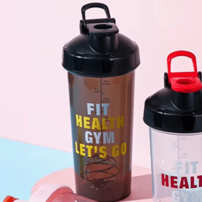 A stylish 600ml shaker bottle featuring motivational text ‘Fit Healthy Gym Let’s Go’ in vibrant colors on a sleek black design. Perfect for mixing protein shakes, pre-workout drinks, and other fitness supplements while showcasing your dedication to a healthy lifestyle. Key features: • 600ml capacity for generous portions • Durable BPA-free plastic construction • Motivational text design in multiple colors • Leak-proof screw-top lid • Built-in mixing ball included • Easy-grip ergonomic design • Measurement markings on the side The shaker bottle features a transparent black body that allows you to monitor liquid levels while maintaining a modern aesthetic. The wide mouth opening makes it easy to add supplements and clean thoroughly. The secure lid design prevents leaks when properly closed, making it ideal for carrying in gym bags or during workouts. The motivational text serves as a constant reminder of your fitness goals.